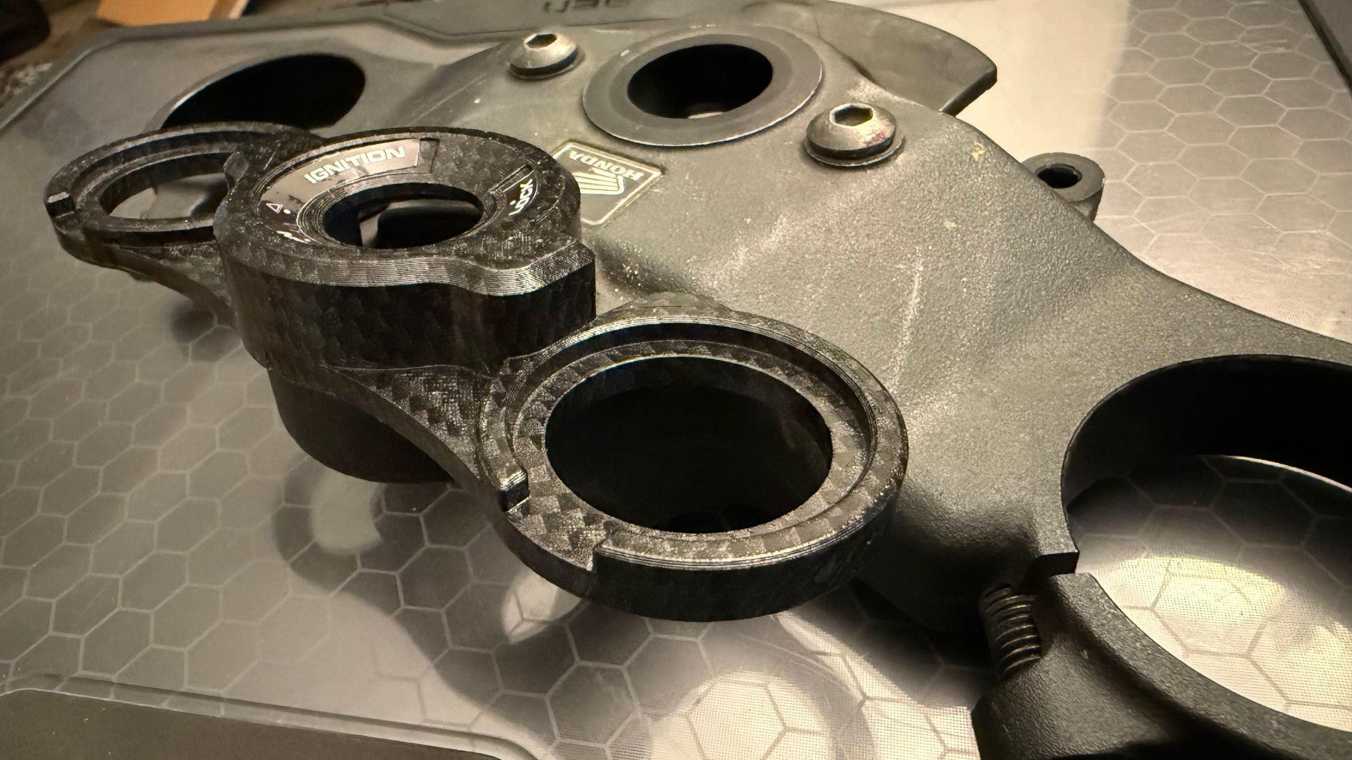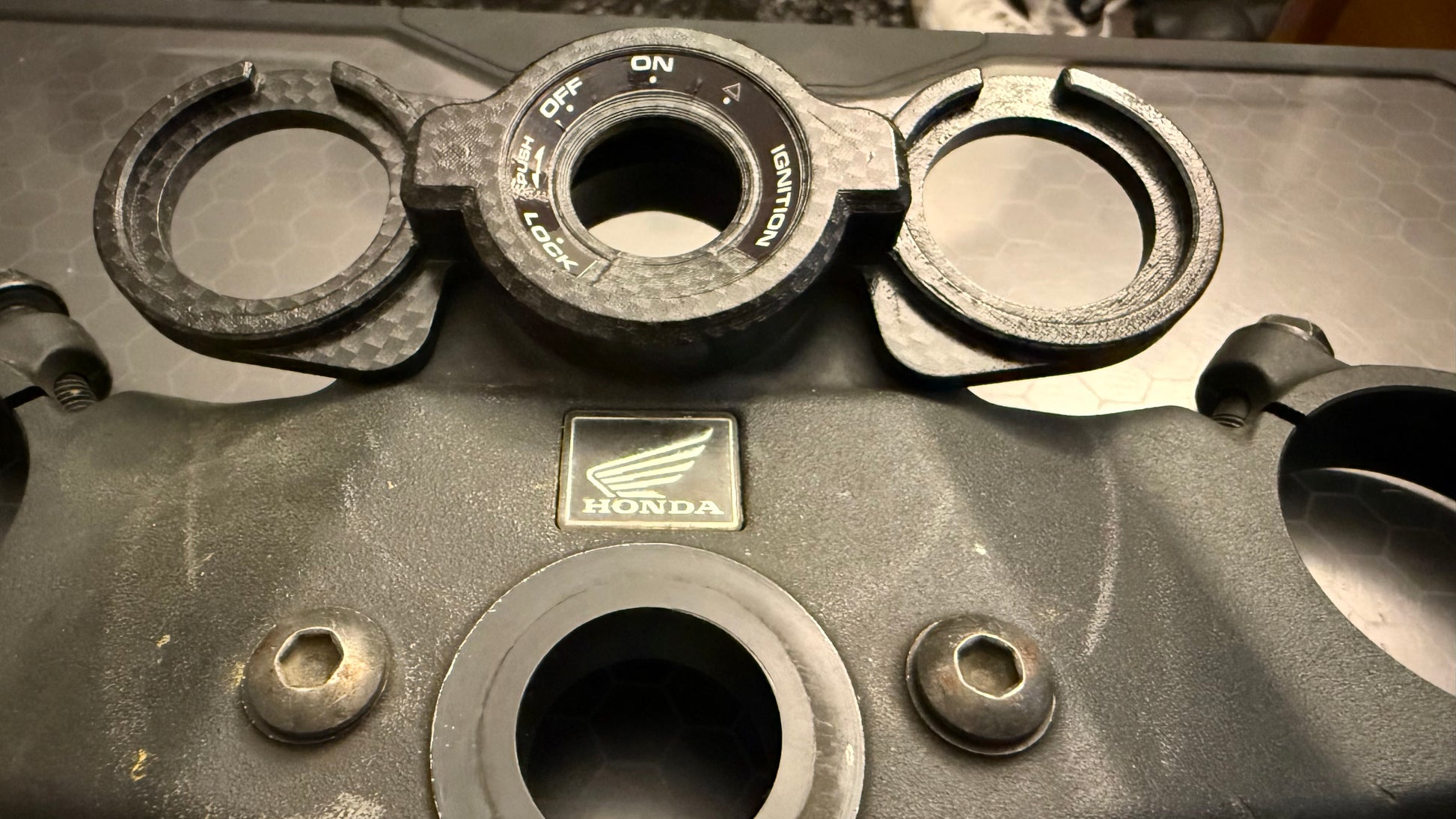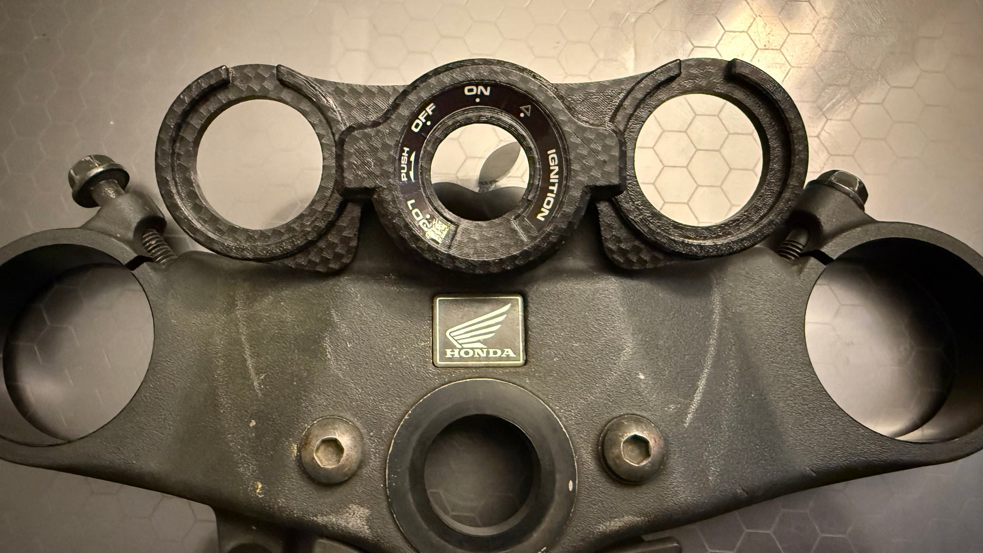These custom brackets serve as a sleek replacement for the standard black plastic bezel found on the key cylinder of 2007-2012 Honda CBR600RR (Non-HISS) models.